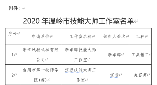 我司根據(jù)《關(guān)于深入實(shí)施2020年度溫嶺市技能大師工作室項(xiàng)目建設(shè)及考核評估的通知》(溫人社發(fā)〔2020〕59號)文件精神,通過自行推薦以及地方政府的大力支持,充分準(zhǔn)備了相關(guān)申報資料,通過主管部門的初審以及專家的評審、部門審議和社會公示等評選環(huán)節(jié),我司最終順利通過評審,被評定為“李軍輝技能大師工作室”并于政府平臺公示。