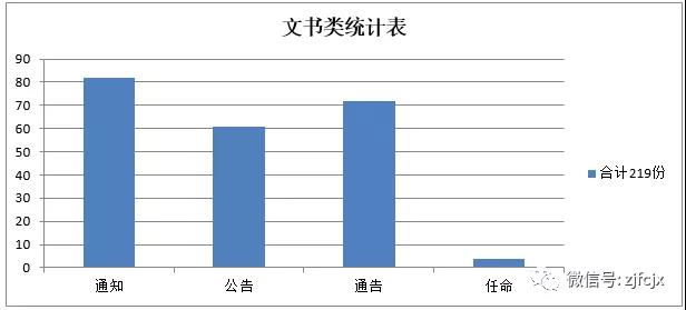 公司所有的文書類如:通知、通告、公告、任命等統(tǒng)一有正規(guī)格式,經(jīng)編輯、審核、批準(zhǔn),統(tǒng)一由總裁辦渠道發(fā)布。經(jīng)對2018年文書類統(tǒng)計,各類發(fā)布如下:通知82份、公告61份、通告72份、任命4份,合計共發(fā)布文書類219份。